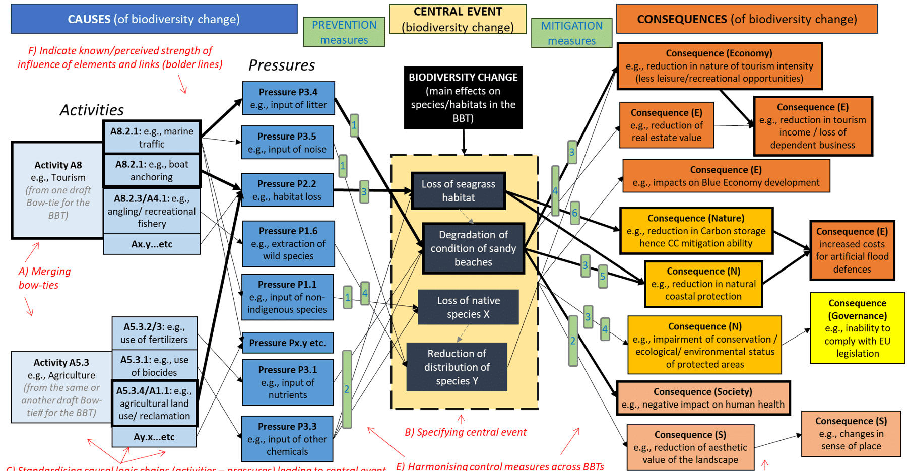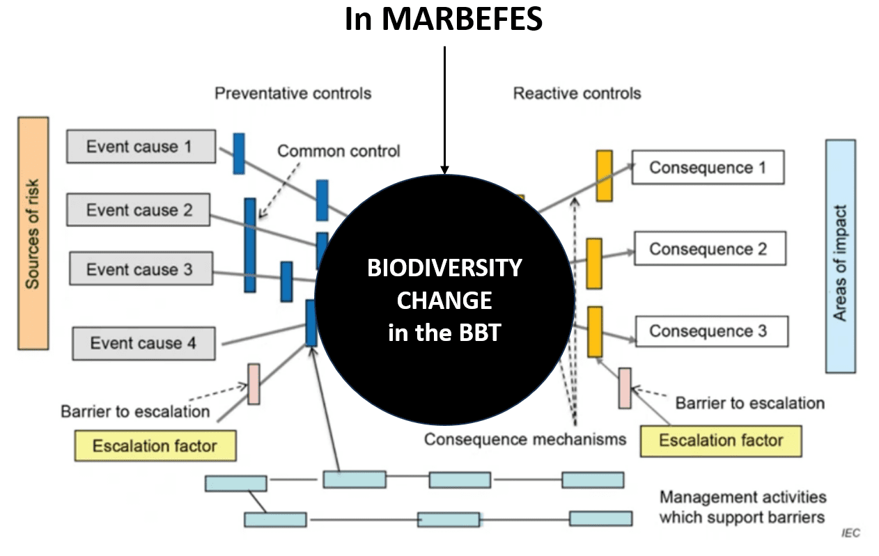 Within MARBEFES, Bow-tie diagrams are developed for each BBT through scenario and storyline workshops with local stakeholders. They serve as problem-structuring methods that can incorporate qualitative knowledge, semi-quantitative scoring, and potentially Bayesian Belief Network modelling. This approach has previously been tested in EU projects like CERES and VECTORS, where Bow-tie diagrams helped to visualise risks of climate change on fisheries and aquaculture.