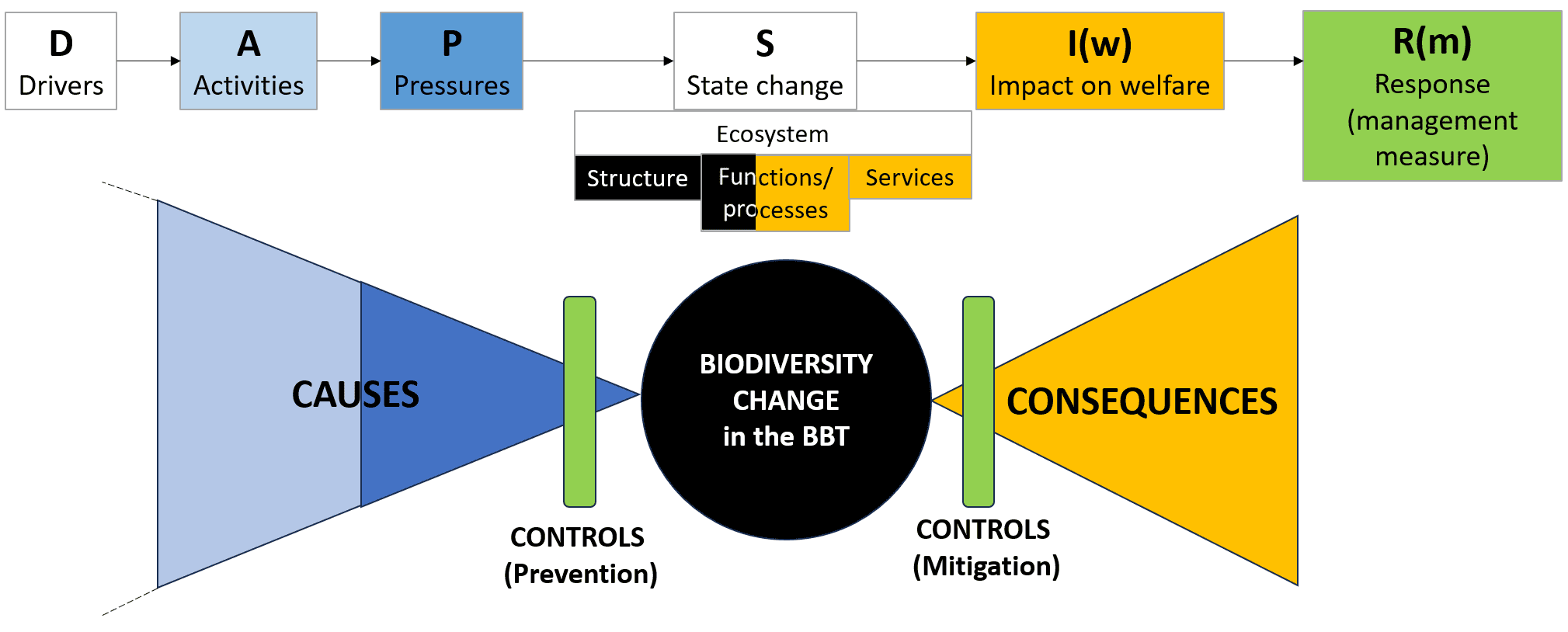 At its core, the Bow-tie diagram depicts a central “knot” representing a key biodiversity risk or management concern in a Broad Belt Transect (BBT). The left-hand side identifies drivers, activities, and pressures (causes), while the right-hand side details ecological and societal consequences. Preventive controls (e.g. policies, regulations, technical interventions) are linked to causes, while mitigation, compensation, adaptation, or recovery measures are linked to consequences. The diagram also allows for escalation factors, which highlight conditions undermining management effectiveness.